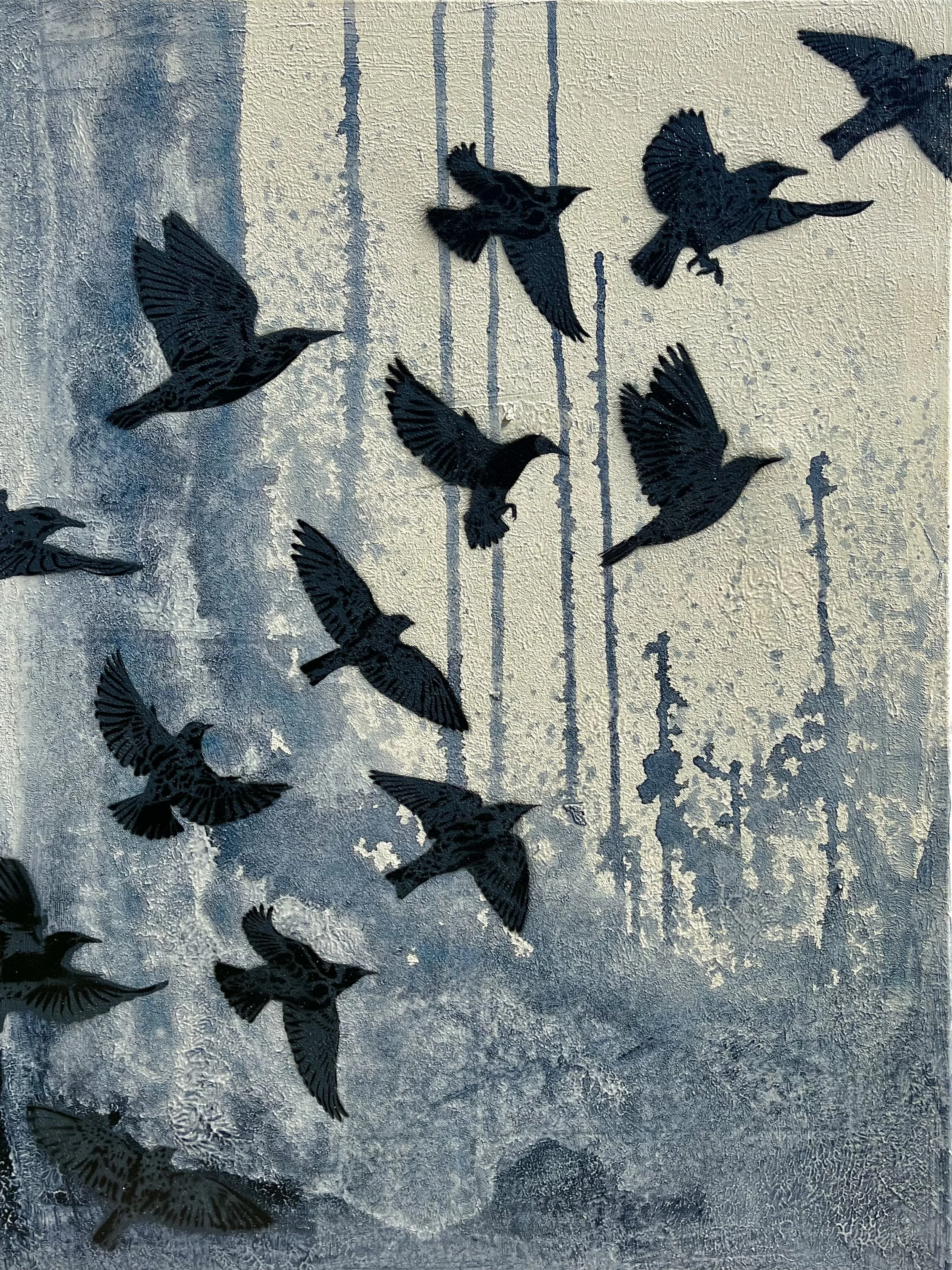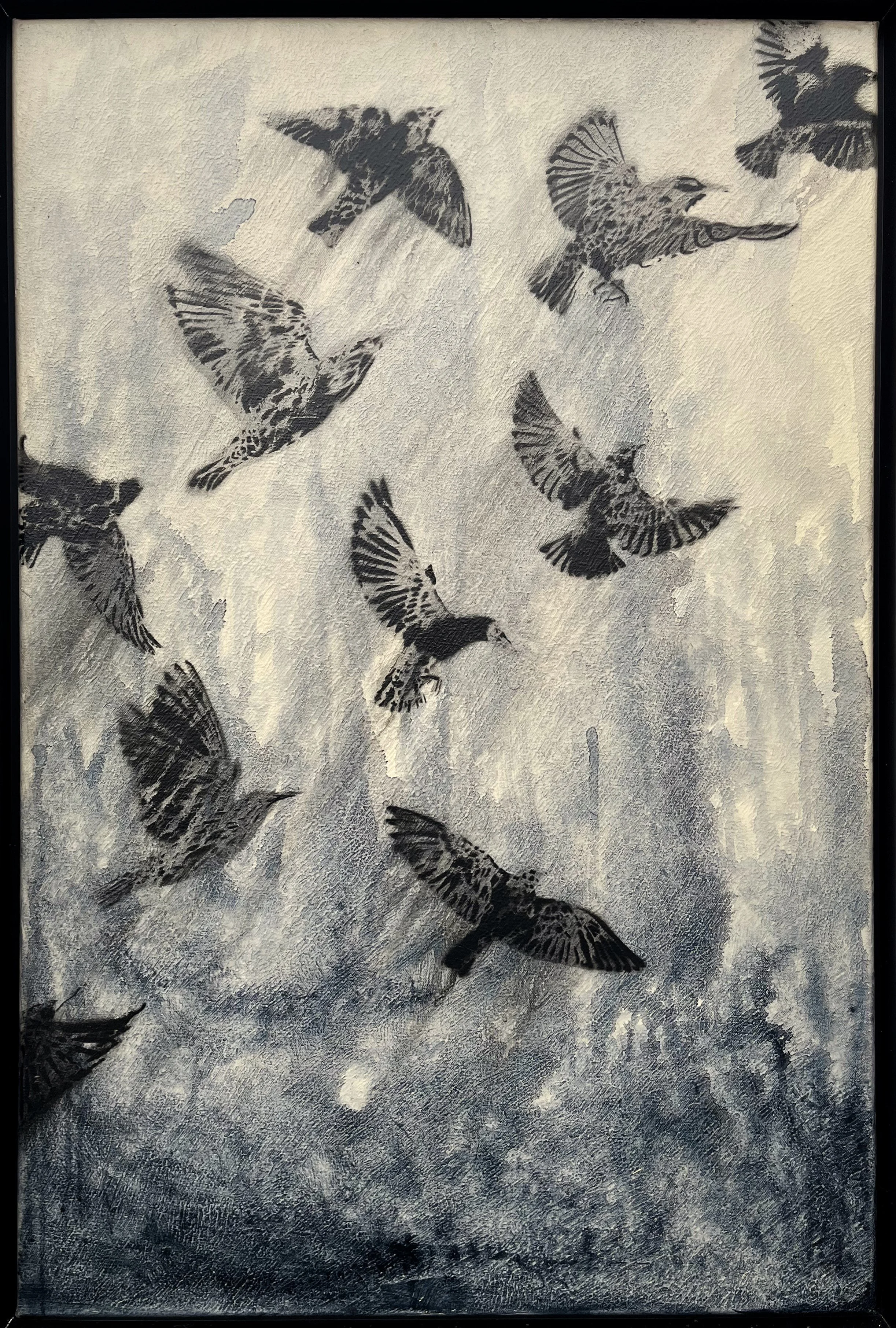 We are the Artists Hoyt, a married artist team consisting of Summer and Evan Hoyt. Taking inspiration from natural and spiritual themes, our body of work interprets subjects such as mated animal pairs or flocks of birds, uniting them with themes such as passion, loss, and triumph. Summer is a painter and illustrator, and Evan re-interprets her designs with hand-cut stencils. Together we create expressionistic paintings using layers of materials such as acrylic, spray paint, and gouache.